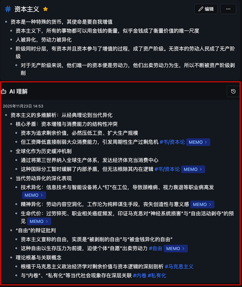 On the supertag page, AI has already organized all card notes under this tag for you and generated an understanding outline on its own.