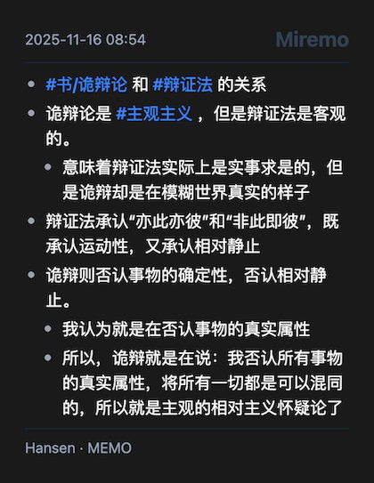 “卡片笔记”的设计,灵感来自于 Zettelkasten(卡片盒笔记法),但又有所不同,Miremo 更加注重卡片的易用性,不论是对于你、或是 AI。